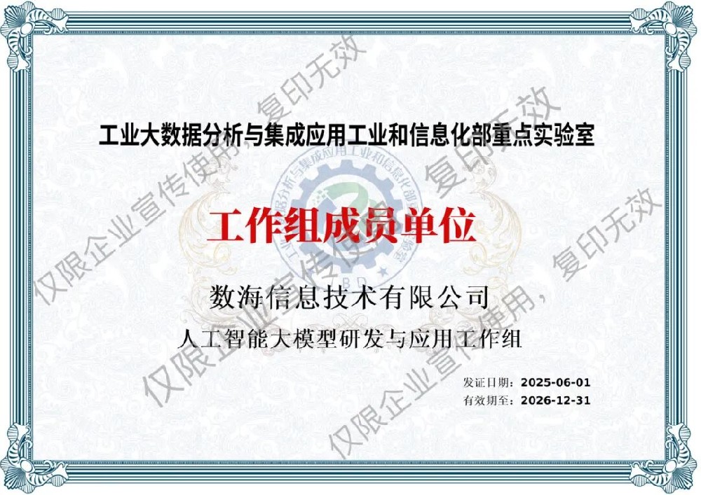 數海信息集團入選工信部重點實驗室人工智能大模型研發與應用工作組,助力工業大數據創新與應用??
